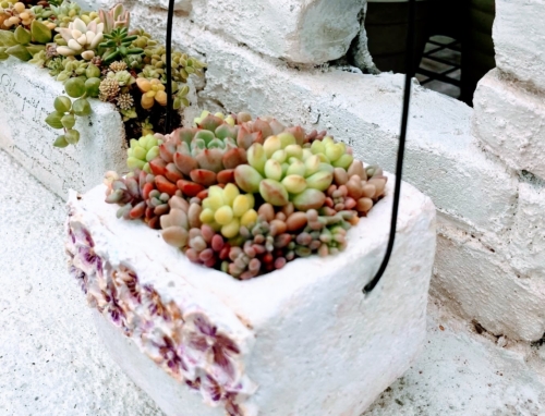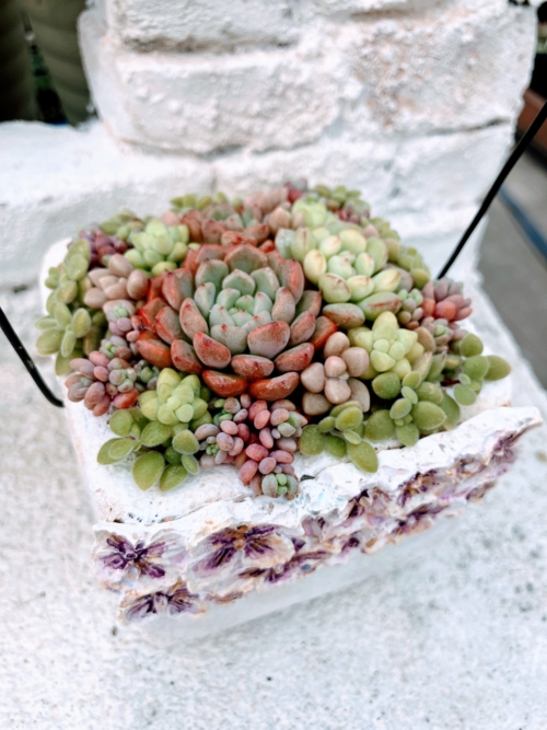 お花のデコポットにつぶつぶ多肉の寄せ植え