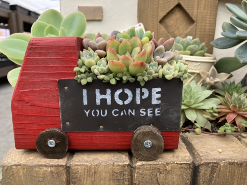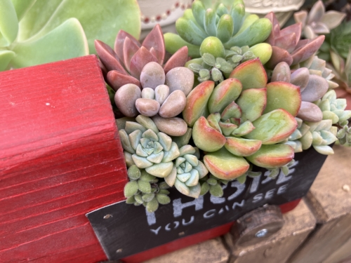 今日の多肉の寄せ鉢は、赤い小さなトラックの鉢にカジュアルな寄せ鉢。